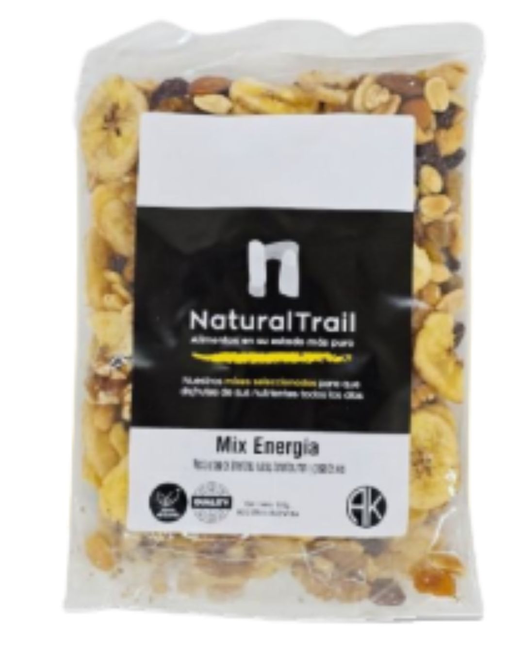 Mix energia x 100 gr (Nueces, Almendras, Pasas de uva rubias, morochas, Banana chips, Mani sin sal) Libre de gluten